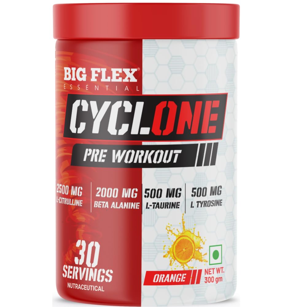 Reviews / Bigflex Essential Cyclone Pre Workout Powder with L-Citruline, Beta Alanine, Taurine, Caffeine for Energy, Endurance, Strength and Focus, Green Apple and Orange Flavor, 300g, 30 Servings